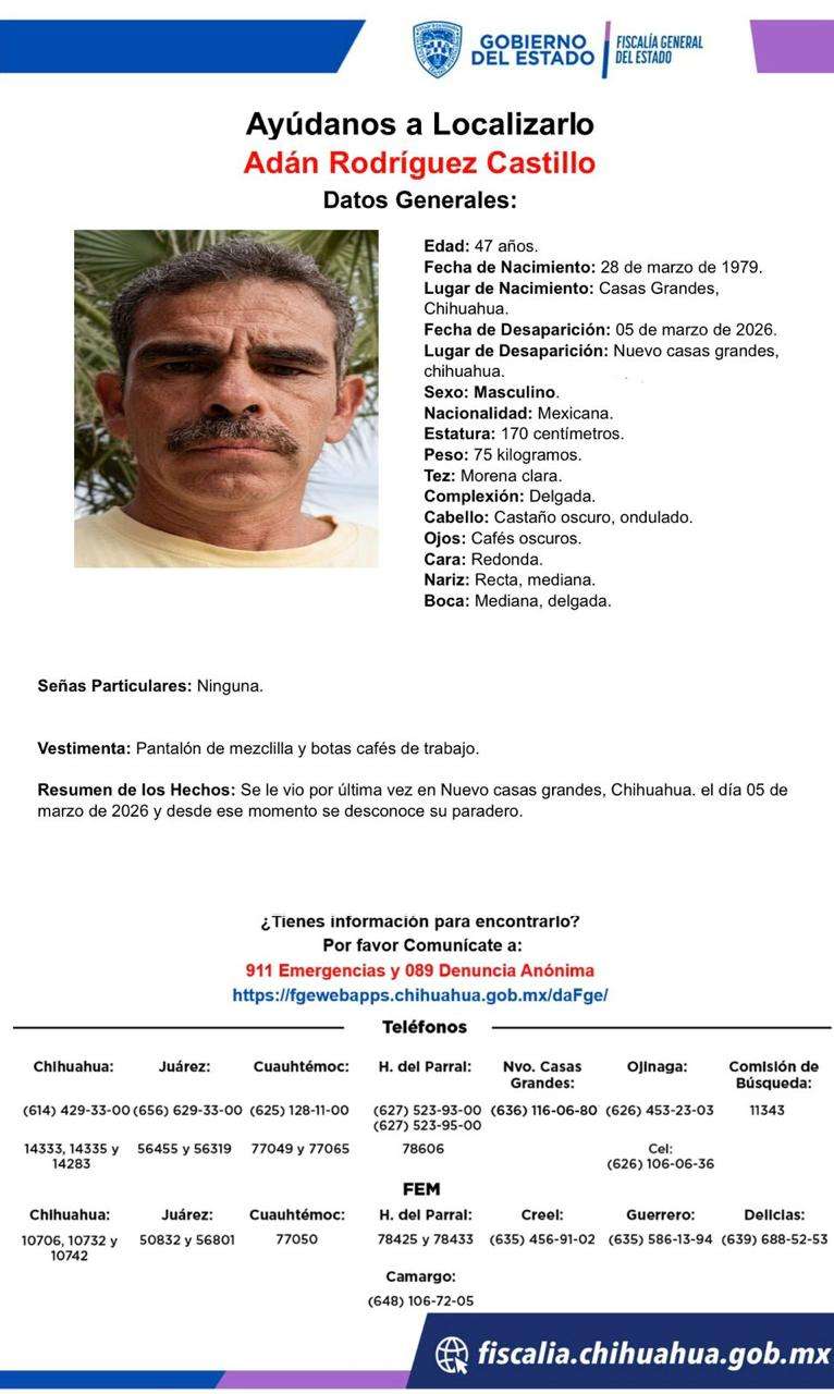 Nuevo Casas Grandes, Chih. - La Fiscalía General del Estado de Chihuahua solicita la colaboración de la ciudadanía para localizar a Adán Rodríguez Castillo, de 47 años de edad, quien se encuentra desaparecido desde hace más de un mes. Según el reporte oficial, se le vio por última vez el pasado 05 de marzo de 2026 en la ciudad de Nuevo Casas Grandes, Chihuahua, y desde ese momento se desconoce su paradero.