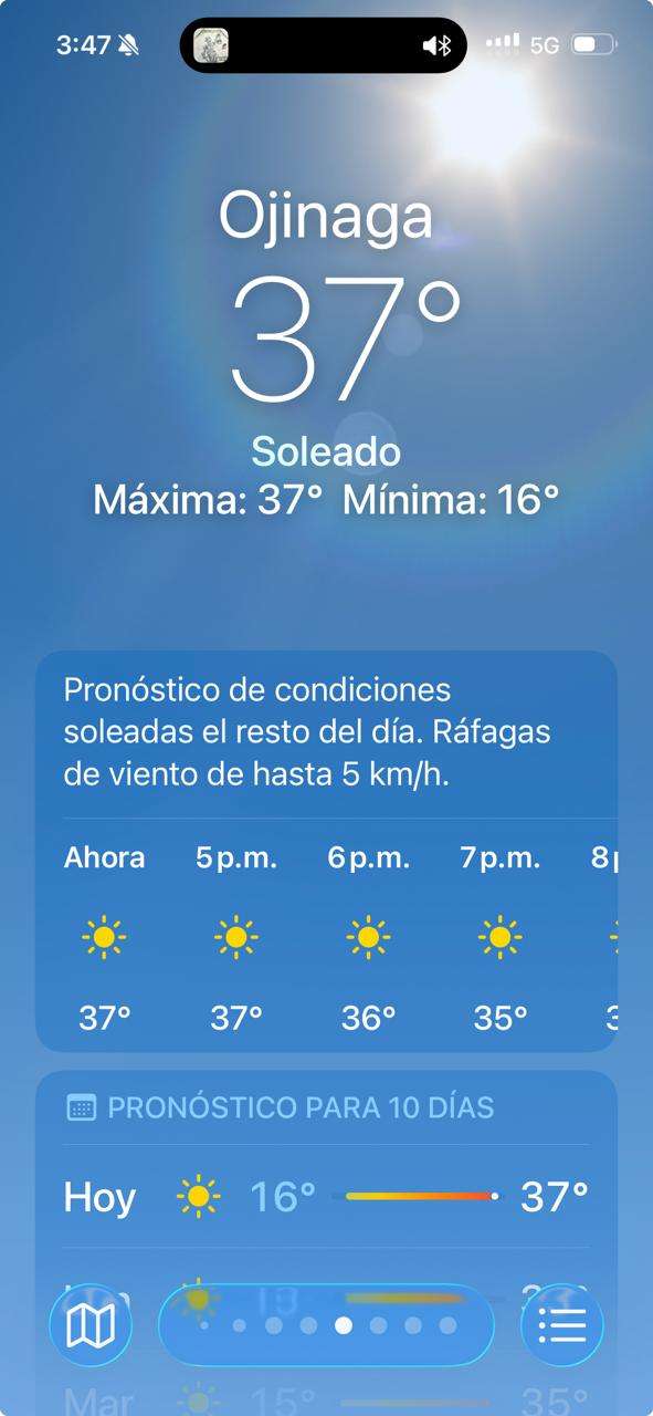 Ojinaga, Chih.- Un intenso calor azota este domingo al municipio de Ojinaga, donde el termómetro ya alcanzó los 37°C bajo cielos totalmente despejados, consolidándose como una de las zonas más cálidas de la entidad en las últimas horas.