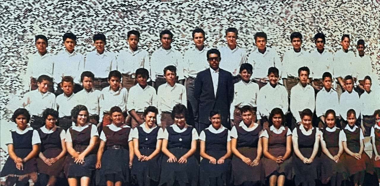 Raúl Martínez Chacón, un virtuoso de la guitarra, a quien la raza vaga le decía Tabaco, ya imaginará usted por qué, posa con un grupo de alumnos de sus clases de Español de la Escuela Secundaria Federal Leyes de Reforma, el segundo plantel de enseñanza media superior de Delicias.