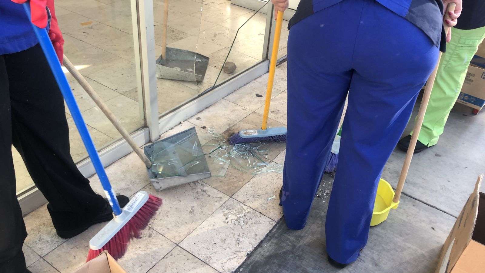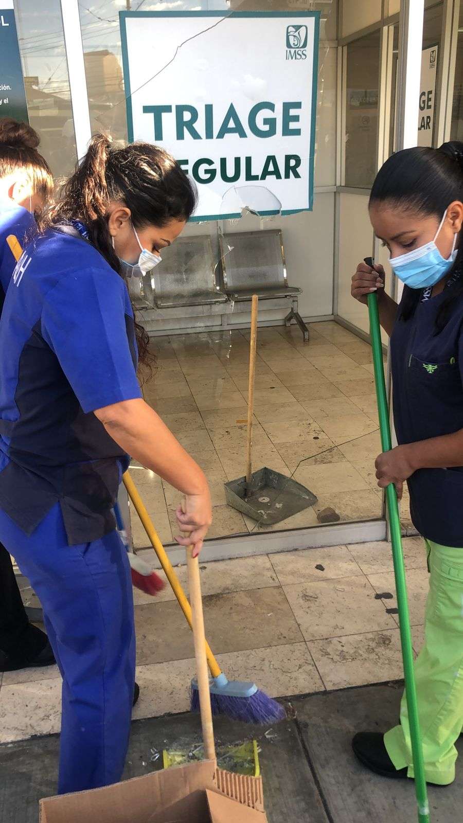 Personal del hospital realizaron labores para retirar partes del vidrio regado en el piso de la sala de urgencias.