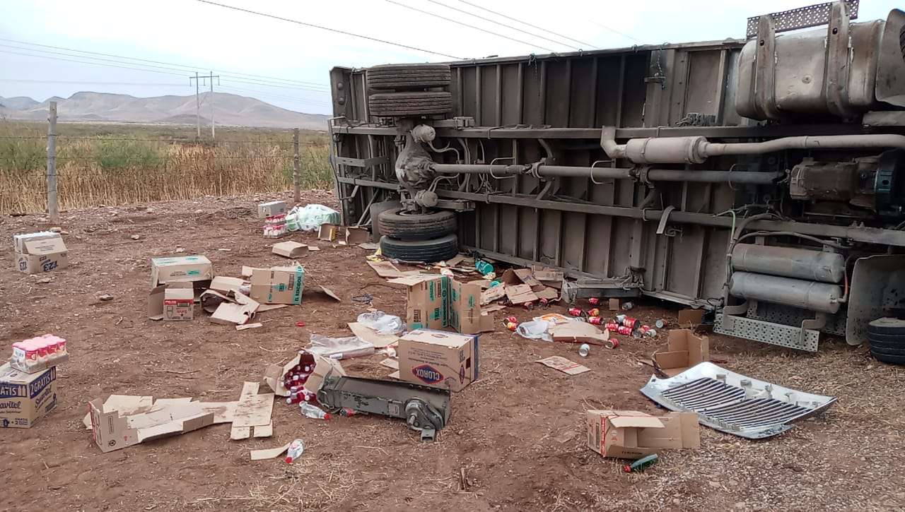 Ascensión.- Un aparatoso accidente se registró esta tarde sobre la carretera a Casas Grandes a la altura del kilómetro 183 de norte a sur, luego de que el conductor del camión perdiera el control y se volcara aun costado de la carretera.