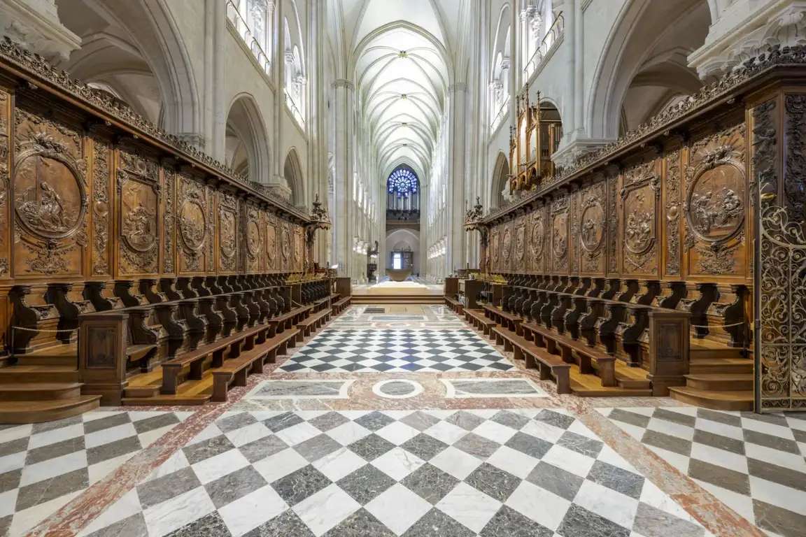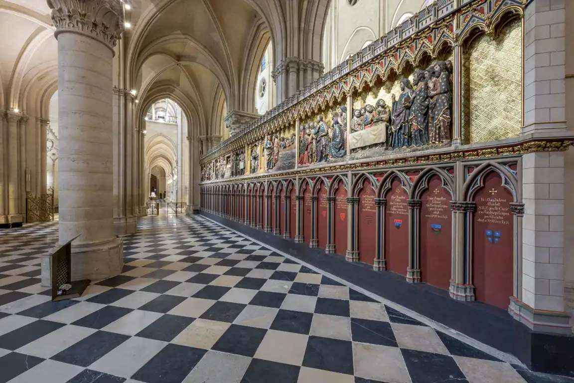 El coro de madera de Notre-Dame no sufrió apenas daños en el incendio, si bien se ha aprovechado el cierre de la catedral para limpiar, dar brillo y detectar posibles problemas de humedad y deterioro. Eso sí, el contraste con las paredes calizas más luminosas de la catedral lo hacen brillar con luz propia.