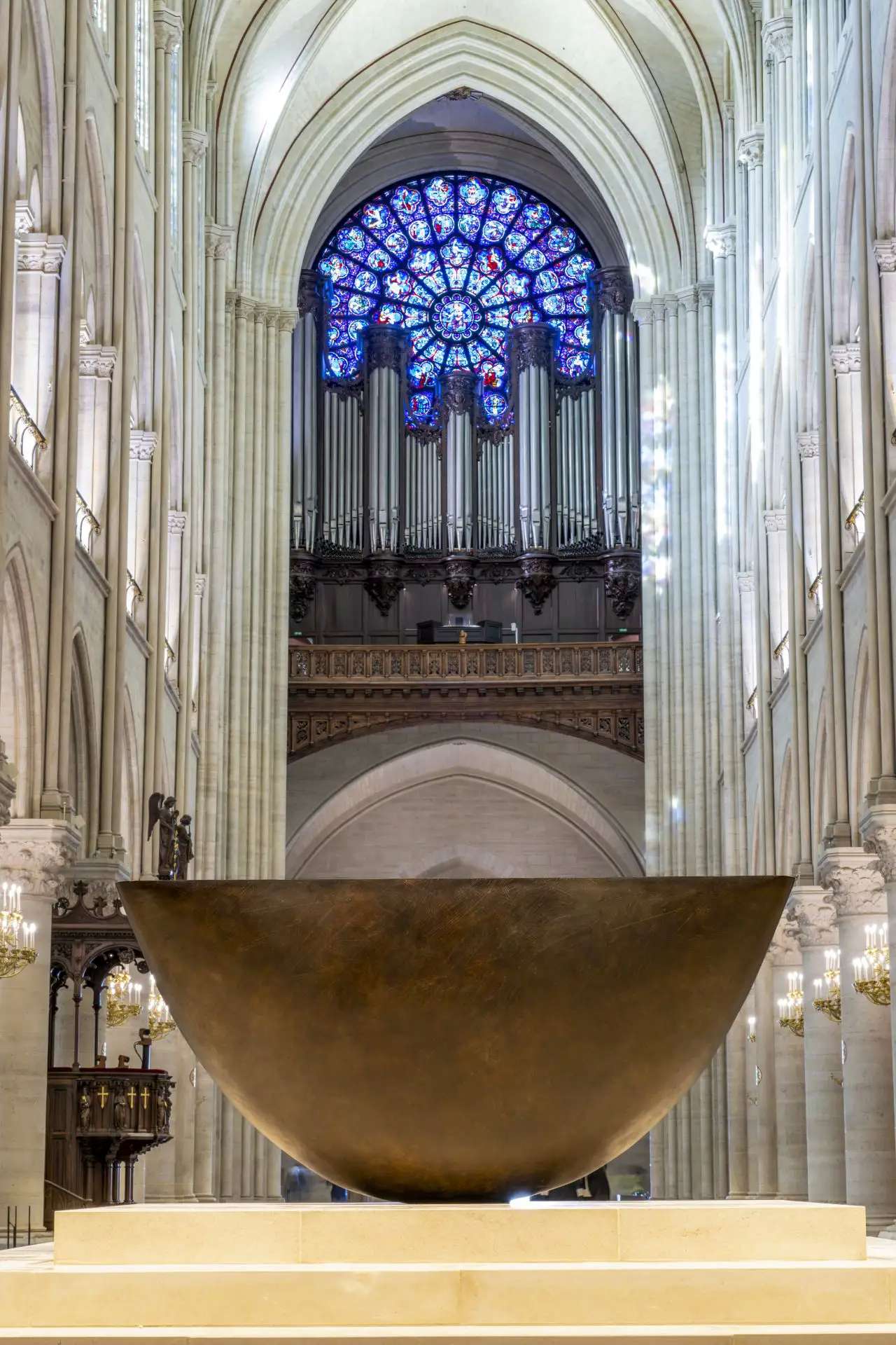 El bronce es el protagonista de las creaciones que el diseñador Guillaume Bardet ha ideado ex profeso para el nuevo mobiliario litúrgico de Notre-Dame de París. Lo escogió por su carácter atemporal y elegante, además de por la noble simplicidad con la que refleja los principios del Concilio Vaticano II. En la imagen, se ve la nueva pila bautismal de la iglesia.