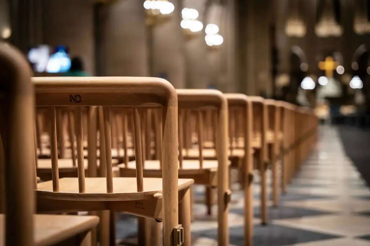 Las nuevas sillas y bancos han sido ideados por la diseñadora Ionna Vautrin. Este mobiliario, creado en roble macizo procedente de los bosques de Sologne, busca dialogar con la arquitectura gótica milenaria de Notre-Dame.