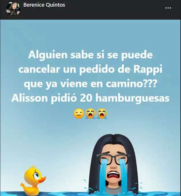 “¿Alguien sabe si se puede cancelar un pedido de Rappi que ya viene en camino?”, escribió Bere en su cuenta de Facebook.